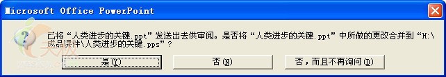 用Powerpoint打开朋友修改过的文件时,会出现一个询问框(图5),单击“是”,即可把修改合并到幻灯片文件中。同样还可以把另外的修改合并进去。幻灯片打开后,所有的修改会用不同的颜色加以标识,一目了然。