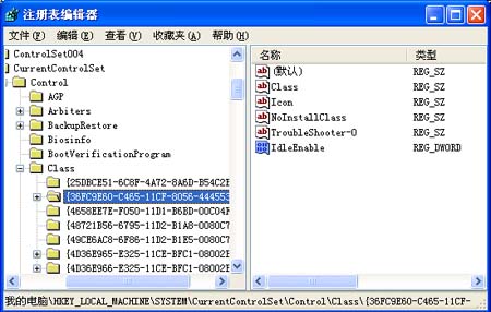 其次将鼠标定位于注册表分支 HKEY_LOCAL_MACHINE/SYSTEM/CurrentControlSet/Control/Class/{36FC9E60-C465- 11CF-8056-444553540000}上,然后依次单击菜单栏中的“编辑”、“新建”、“DWORD值”选项,并将新建立的DWORD值命名为 “IdleEnable”,如图1所示;