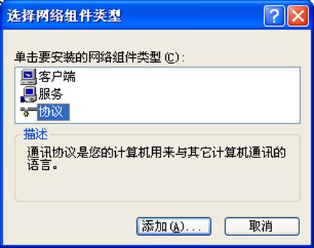 继续单击该界面中的“安装”按钮,打开如图2所示的“选择网络组件类型”选项,然后选择其中的“协议”选项,再单击一下“添加”按钮,并从其后的界面中将“NetBEUI”协议选中,以后按照向导提示将“NetBEUI”协议正确安装好。
