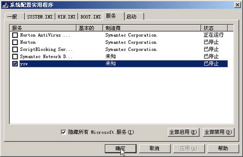 要启动停止的服务,在服务名前打上小钩即可启动。勾选“隐藏所有Microsoft服务”,此时列出的就是其它软件注册的系统服务(图7),通过“制造商”大体可以判断出服务是否是病毒/木马,如笔者电脑上的“Norton Antivirus自动防护服务”,制造商为“Symantec Corporation”(赛门特克公司),就是诺顿杀毒软件注册的服务,而“YZW”这个服务则极为可疑,经检查它正是一个木马。