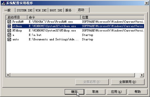网上介绍过许多专门管理自启动程序的软件,其实Msconfig的自启动管理功能并不比这些软件差。单击主界面的“启动”便可列出电脑所有的自启动项目(图8),这里列出启动项目名称、程序所在路径和启动位置,对于加载在注册表启动的程序,它还给出了详细的键值提示而无需打开注册表编辑器,如C:WINDOWSSystem32ctfmon.exe (系统输入法程序),它便是通过HKEY_LOCAL_MACHINE\SOFTWARE\Microsoft\WindowsCurrentVersion\Run这个键值来实现自启动的。