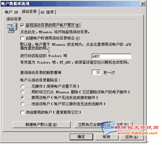 1.      完美整合Windows Active Directory。只需简单点击鼠标启用此功能,MDaemon即可随时跟踪同步Active Directory中账户的增删和改动,并且支持多种的账户删除模式,更加便于公司管理流动人员。MDaemon9.0是现今除了Exchange 之外,唯一可以与WindowsActive Directory结合使用的邮件系统。(见下图)