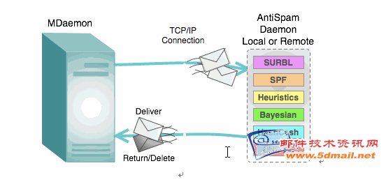 2.      MDaemon9.0中,IMAP服务、内容过滤器、垃圾邮件过滤器、病毒过滤器等在设计上的重大革新和高性能、多线程设计带来了处理速度上的突飞猛进。另外,AntiSpam功能组件从MDaemon9.0开始可以在网络后台单独处理邮件收发,并可以和主程序分离,在另外的服务器上单独运行。(如下图)