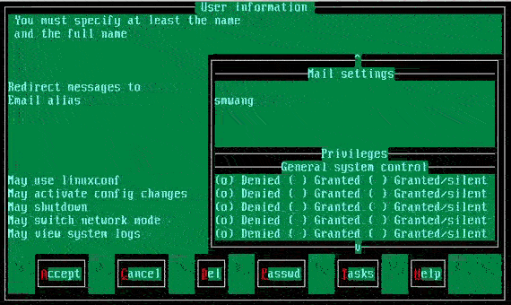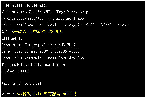 认识邮件运送的过程 基本上,当你使用 E-Mail 讯息时,信件是如何运送的呢?通常是如下图这样运送的: ![]() 你的信件将经过 smtp 协议传送至 邮件服务器 ,然后邮件服务器将视有无设定转信主机(Mail eXchanger, MX),若有转信主机,则信件先经过转信主机后再传到目的邮件服务器,若无转信主机,则信件将直接由你的邮件服务器送至目的邮件服务器,最后,由你的收件者以 pop-3 协议,将信件由对方的邮件服务器中捉下来!举个例子来说,如果你要从 kimo 寄信给鸟哥的话(tsai.adsldns.org),那信件是如何传送的呢? 1. 你在 Windows 系统中写完了信,以 smtp 协议将你的信传送至 kimo.com.tw 这个邮件服务器; 2. kimo.com.tw 这个邮件服务器将你的信转送至鸟哥的 tsai.adsldns.org 这个邮件服务器; 3. 鸟哥在 Windows 系统中,以 pop-3 协议将这封信由 tsai.adsldns.org 捉下来计算机中! 大致的流程就是这样而已。底下来说说一些邮件的术语: · MUA(Mail User Agent ):照字面的意义来说,就是所谓的『邮件代理人』,MUA 从字面上看似乎好容易给它吓死﹐但说穿了您可能会笑耶﹕我们平时用的 Outlook Express、Netscape Mail,或是 Linux 上面的 pine ﹐它们都是 MUA 。简单说﹐MUA 是用来给使用者流览邮件和书写邮件的程序; · MTA(Mail Transfer Agent ):照字面的意义来说,就是『邮件传送代理人』,我们管它叫邮件服务器好了﹐它负责 MUA 的请求﹐也负责将邮件从一个 MTA 传到另一个 MTA 。通常一个 MTA 都可以支持好几种邮件协议﹐例如﹕ UUCP、SMTP、POP 等。 UUCP (Unix to Unix Communication Protocol) 现在已经比较少用了﹐取而代之的是 SMTP (Simple Mail Transfer Protocol) 和 POP (Post Office Protocol) 这两个协议。 SMTP 负责的将邮件从 MUA 上传给 MTA﹐也是 MTA 和 MTA 之间的邮件传递协议﹔而在没有 POP 之前﹐email 的使用者一般都要用 telnet 或其它远程控制程序连上 MTA 那里﹐然后在那里阅读邮件﹐而有了 POP 之后﹐ MTA 可以将使用者的邮件存在一个档案里﹐然后使用者通过 MUA 连到 MTA ﹐再将信件下载回本地机器阅读。另外﹐ MUA 和 MTA 都无需是同一个厂家的软件﹐只要双方都支持 POP 协议就可以了﹐其灵活性是不言而喻的了。有些程序﹐如 sendmail ﹐表面来说﹐就同时具备 MUA 和 MTA 功能了。 · 我们用 MUA 撰写邮件之后﹐是通过 SMTP 协议上传给 MTA 的﹔而阅读邮件则是通过 POP 从 MTA 那里下载回来。 Mail 与 DNS 的相关性: 与 mail 最具相关的大概就是 DNS 的设定了,例如你要寄信给我的话,就要寄到 vbird@tsai.adsldns.org 这个信箱,因此,如果你要架设邮件服务器的话,请务必将你的 DNS 设定正确!否则一定信件是寄不到你的信箱的喔!而由于我们是使用 ADSL拨接系统 来上网的,所以只好申请动态 IP 啰! ----------------------------------------------------------------------------------------------- 简易的设定 sendmail 开始设定前的准备工作: 在开始设定你的邮件服务器之前,请先让你的主机具有 DNS 可以追查到的功能啰!申请 DNS 主要有两种方法: · 若你在学术系统中,你可以直接向您的上一层 DNS Server 的管理员申请,由于你具有固定 IP ,所以架设上会很方便; · 再来,如果你与我相同是使用 ADSL拨接系统 的话,由于没有办法具有固定 IP,所以只好申请动态 IP 的 DNS 系统了,详细的申请步骤请至『动态 DNS 申请』中察看。 请千万注意,由于 DNS 设定错误将使你的信件无法收取(不过发信可能没有问题!)因此这一部分请仔细的设定喔! 设定 sendmail : 如果你是使用这个网页介绍的 Redhat 6.1 来安装你的 Linux 的话,那在你安装好了 Linux 时,你的邮件服务器已经架设好了!不相信吗?假设你的 ID 是 test,则你可以进入 Linux 之后,输入这样的字眼: 然后你只要输入 mail 即可收信喔! 简易的设定 sendmail 虽然你的 Linux 已经具有收发信件的能力,但是你也可以看到,上面的例子中,所显示的邮件主机是 localhost.localdomain ,这是不对的!寄给别人的信也是使用这一个名称的话,当然人家一定寄不到你这里来啦!所以要设定一下你的 sendmail 啦! · netconf 设定邮件服务器: 基本上,设定邮件服务器只要两个步骤: 1. 一个是使用 netconf 简易的设定好主机的名称与其它与主机相关的事项; 2. 然后再修改 /etc/inetd.conf 这个档案,开启 pop-3、smtp 及 imap 的服务即可! 这个 IMAP 是目前新的邮件协议﹐通过 IMAP﹐ 使用者在 MUA 那端就无需分别指定 SMTP 和 POP 作为上传和下载协议了﹐而只一个 IMAP 协议就可以﹐而且 IMAP 还可以让不同的使用者共享一个 MUA﹐非常方便哦。 netconf:好了,现在来设定一下主机吧: 1. 以 root 的身份执行 『netconf』,会出现一个窗口; 2. 向下移动光标到 『Mail delivery system (sendmail)』 这一项,并按下 enter 键; 3. 在出现的框框中选择 『basic information』 这一项; 4. 在 『Present your system as』 及 『Mail server』 这两个地方,都输入你在 动态 DNS 系统中申请到的名称(以我为例,在这两个地方都输入 tsai.adsldns.org 即可);另外,在这勾选两行中间的 『[X] Accept email for adsldns.org』 这一个咚咚,这样就设定好了! 5. 以 Tab 键将光标移动到 Accept 这一项,按下 enter,回到刚刚的画面; 6. 按一次 Quit 出来主选单,选择『Basic host information』这一项,按 Enter 进入; 7. 在 『Host name』的地方输入你的主机名称,另外,在 『Primary name + domain』 的地方也要输入一次刚刚输入的名称喔!(就是 hostname.adsldns.org这一个!); 8. 按下 Accept 退出来之后,回到刚刚的画面; 9. 由于 Redhat 