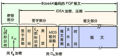 PGP的报文格式如图10.25所示。可以看出,PGP报文由三个部分组成,即报文的IDEA密钥部分、签字部分以及报文本身。密钥部分不仅是密钥,而且还有密钥的标识符,因为用户可能拥有多个公开密钥。