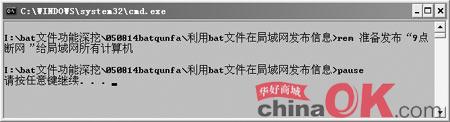 将其保存为bat文件,双击后得到如图2所示的效果。再按键盘上的任意键,信息将被发送到全网。如果你希望它定时发送,则将pause字段去掉,然后将其加入到计划任务中即可。