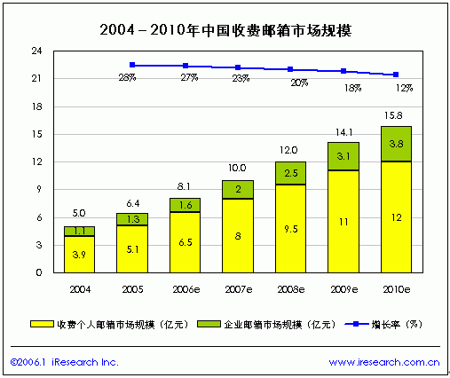 2005年中国电子邮箱市场规模为6.4亿元,比2004年增长28%。预计到2010年该市场将接近16亿元,复合增长率为20%。2005年个人收费邮箱为5.1亿元,比2004年增长31%,在整体市场中所占比重为80%。个人收费邮箱市场正在走入成熟期,企业邮箱则有更大的发展潜力。预计到2010年企业邮箱所占比重将从2005年的20%提升到24%。根据艾瑞最新发布的《2005中国电子邮箱市场研究报告》,未来五年内中国电子邮箱市场将步入一个平稳发展期,增长率逐步放缓,市场竞争更趋激烈,以手机邮箱为代表的新兴服务将得到更大发展。