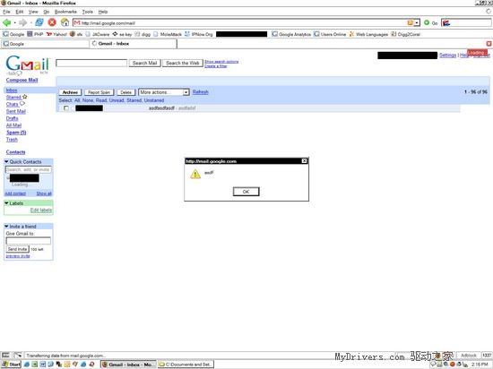 安东尼是在给朋友发送邮件的时候发现这一漏洞的。他使用一个雅虎邮件帐户给自己朋友的Gmail帐户发送了一封内含JavaScript代码的信件,然后发现信件预览区内的代码被执行了。