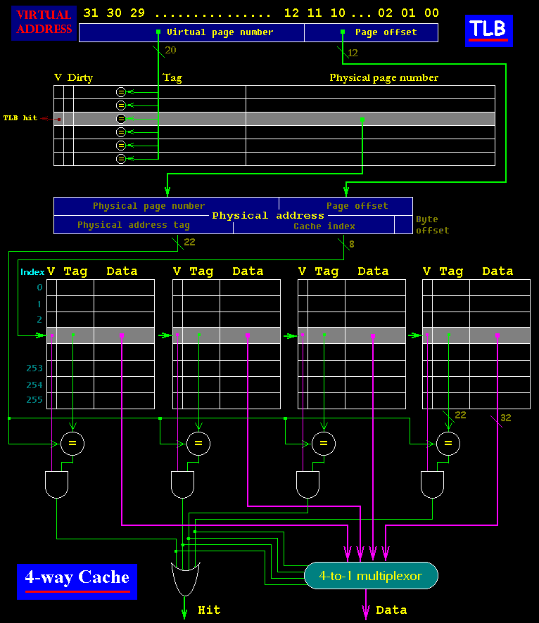 | TLB miss: 4G(32-bit)的存储空间,如果按4K分页,则可分1M页。每个页表项为4B,则一个页表大小为4MB。由于页表太大,只能放在主存中。这样每次读内存都要读主存,大大影响读写速度。而同样基于局部性原理,整个页表在某一时刻,所用的也仅仅几页而已。所以我们把某段时间经常用的几个页表项,即常用的虚拟页号和其对应的物理页地址,存在Cache中,即TLB。 这样,当程序需要调用某个存储单元的内容时,先根据它的线性地址,算出其所在的页。先查TLB(比较虚拟页号),如果有相同的虚拟页号,则就可以马上知道其所在的物理地址,根据物理地址进行存取。 如果没有相同的虚拟页号,则说明该页没有记录在TLB中,那再去查页表,按page fault中所说的进行。 TLB像我们随身记录电话的小纸片,当要查一个电话时,我们先看小纸片。有,我们可以直接打电话。如果没有,我们再回家查详细的电话号码簿(页表),再打电话。 |