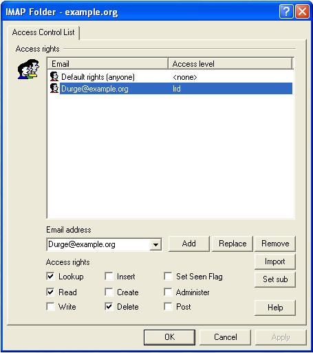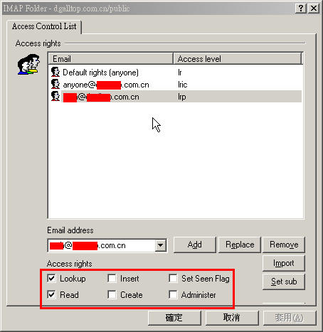 如果你無法直接勾選Write、Delete、Post權限,可先選取其上的權限,再按一下TAB鍵,再按一次空格鍵來選取此權限。如此一來,有DELETE權限的用戶就可以直接從公用資料夾中清除過時的郵件﹔有Write權限的用戶可以直接增加、修改公用資料夾中的郵件。