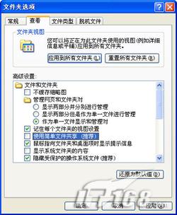 第五步:但是有的时候即使你的系统转换成NTFS格式也没有出现安全标签,特别是对XP系统来说,当我们在想设置共享权限的文件夹上点鼠标右键选择“共享和安全”后出现的设置窗口中却没有“安全”标签。(如图5),要想共享只能把该文件夹或文件复制到“共享文档”中。实际上这是因为我们使用了简单共享方式,要想取消这种简单共享方式需要打开“我的电脑”,在上方菜单中选择“工具->文件夹选项”。在“查看”标签中找到“使用简单文件共享”,将其前头的对勾去掉即可。(如图6)
