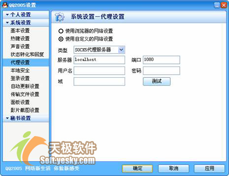 第8步:现在只需双击SocksCap控制台界面里的图标就可以了通过HTTP代理玩OICQ了。注意:在SOCKSCAP中运行的ICQ等软件不需再对代理做特别配置,在使用过程中,不可以关闭sockscap32,否则已在其上运行的程序就不能正常继续运行。另外,也可以直接在OICQ中进行设置。如QQ2005中,进入“系统设置”界面,选中“代理设置”选项,在该界面中选中“使用自定义的网络设置”并选择“SOCKET5代理服务器”,在防火墙地址栏填入localhost,在端口栏填入1080。重新登陆后,现在OICQ就是通过代理上线了!如图18所示。如果需要测试此服务器是否正常,可以单击“测试”按钮进行测试。ICQ、MSN等其他聊天工具或浏览器的设置与之类似,用户可以多多体会。