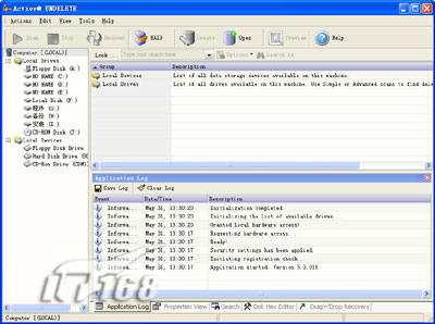 2、Active@ Undelete的界面显得甚为专业,在默认状态下,如果你觉得显示视图过多,则可点击“View”菜单,在其下级子项中可按需选择。
