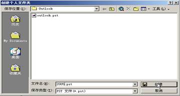 2.在“创建个人文件夹”窗口中的“文件名”中填入“2005.pst”,点击“创建”按钮。