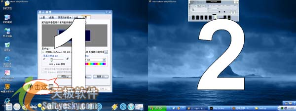 第一步,确定两台显示接在显卡上的顺序,告诉你一个简便易行的办法:在Windows XP中打开“显示 属性”,打开“设置”选项卡,单击“识别(I)”按钮,这时你就会看见1、2,剩下的就不用我说了吧。在我的机器上TCL的为1号,EMC的为2号,1号在左侧,2号在右侧。如图-1。