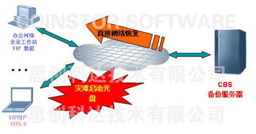 当系统发生无论是软件或硬件上的故障时,无需重新安装系统,无需重新配置,无需重新安装各种应用程序,只要在排除硬件故障后,通过CBS的灾难恢复启动光盘,启动机器,只需按一个按键就可以进行快速的自动的智能恢复,可以保证在最短的时间内恢复系统运作。