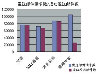 我们此次测试重点考察了最大并发数、成功发送邮件百分比等指标,而用户通常的测试方法是在一定时间内通过服务器进行发送和接收邮件(一台服务器的情况下),得到发送和接收邮件的总数。我们认为许多性能的具体细节使用这种方法很难测试出来。比如,最大并发数反映了服务器在某时刻能够提供服务的能力。