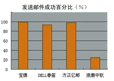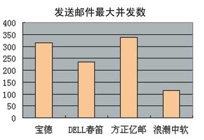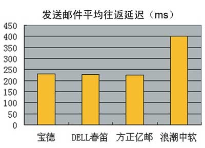 用户接收邮件时间的检验结果是,Dell春笛方案在1000封邮件刚发送完成就收到321封邮件,5分钟以后全部收到;浪潮中软在刚发送完成收到384封,5分钟以后全部收到;宝德功能服务器在刚发送完成以后就全部收到;方正亿邮方案在刚发送完成收到863封,5分钟后收到878封,10分钟后全部收到。