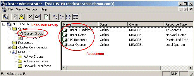 可使用名为 Cluster Administrator (Cluadmin.exe) 的工具管理群集。下面是工具界面示例。
