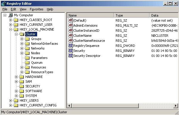 在一台群集服务器上,有一个称作 Cluster 的注册表单元,该单元位于 HKeyLocalMachine 之下。