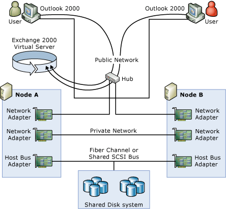 下图展示了虚拟服务器的概念以及它与实际的群集节点的关系。用户将打开他们的 Outlook 客户端并通过网络连接到当前被节点 A 拥有的 Exchange 虚拟服务器。节点 A 是控制包含 Exchange 2000 Server 数据库的共享磁盘的节点。