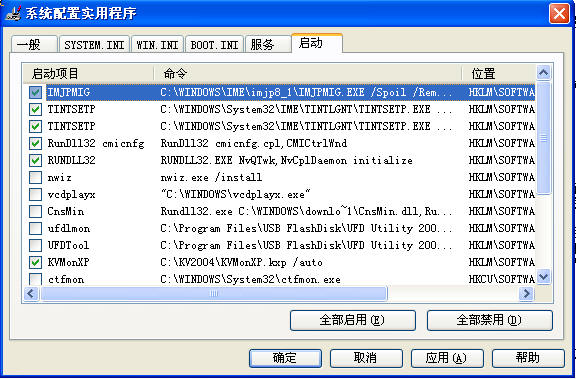 二、开始→运行,输入msconfig→确定。在打开的系统系统配置程序里,将一些不重要的服务以及启动程序关闭,重启电脑。