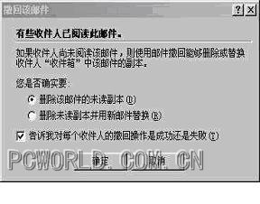 如果邮件的收件人尚未阅读邮件或将邮件从其“收件箱”中移出,就可以撤回已发送的邮件。方法是:在“已发送的邮件”文件夹中,打开要撤回的邮件,在“动作”菜单上,单击“撤回该邮件”,然后选择“删除该邮件的未读副本”(见图2),若要接收有关对每个收件人的撤回是否成功的通知,请选中“告诉我对每个收件人的撤回操作是成功还是失败”复选框。