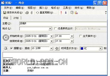 经常或定期要做的事情,只需在日历上设置一次,Outlook就会每次按时提醒你,操作方法:选择“Outlook快捷方式”中的“日历”进入日历,如果要安排某天的约会,只需在月历栏中选中日期,然后日期就会出现在左边的日期栏里,这时用鼠标左键拖动,选择约会开始和结束的时间,选定后单击右键,选择“新建约会”,在新窗口中填入主题和地点等信息即可。