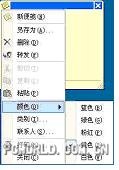 便笺可以方便地让你记录任何零零碎碎的信息,并加以分类。使用方法:在Outlook XP中单击“便笺”,按下“Ctrl+N”可以建立一条便笺,在便笺上输入你要记录的信息,任何文本信息都可以;接下来给它分类,在便笺左上角的小图标上点鼠标左键,弹出便笺的属性菜单(见图6),选择“颜色”改变便笺的颜色以示区别,选择“类别”可以制定便笺的详细类别、甚至可以自己制定类别的名称;选择”联系人”可以将你的便笺发给你的同事;最后关闭便笺,它会自动存盘并以便笺的第一行作为标题,非常好找。
