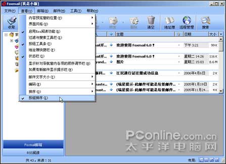 Foxmail 从6.0推出了新的邮件列表样式,这样可以将邮件进行分组。功能有些类似于Gmail的邮件自动分组。可以为邮件的查看带来不少方便。但并不是所有人都喜欢。在以前的版本中无法恢复到传统的列表样式,beta 3 允许恢复到传统的邮件列表方式。可以通过菜单“查看”=>“按组排列”选项取消(图3),这样就恢复了传统的邮件列表样式(图4)。