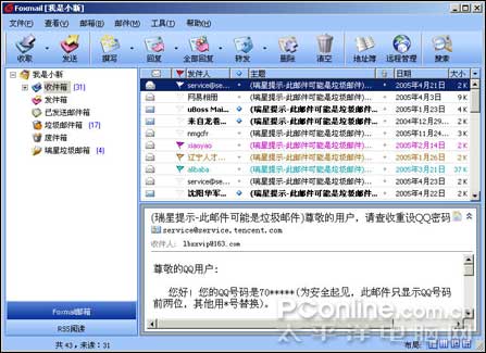 在beta 1中加入的RSS阅读功能,在beta 3 中得到了进一步的改善。个人使用之后,发现原来读取RSS信息的时间大大缩短,由原来的十几秒缩短为只有几秒,读取信息的时间缩短为了原来的三分之一。而且笔者以前使用智能ABC输入法,然后再运行Foxmail,就会出现主界面闪烁的情况。而在切换邮件列表的时候,也很容易出现主界面闪烁。在最新的beta 3这个版本当中终于解决了这个问题,无论什么情况也不会出现Foxmail主界面闪烁的情况了。