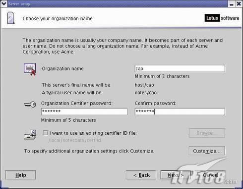 5. 接着填写组织名称和密码,其中Organization name:easy (输入组织名称)Organization certifier password:xxxxx (输入组织名称的验证密码)Confirm password:xxxxx(输入确认组织名称的验证密码)见图7,也可以通过选择右下方的方框利用已经存在的服务器ID进行安装。然后按“NEXT”键继续进行。