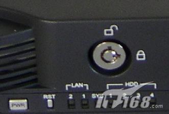 该产品是由5块80G的硬盘组成的,5块硬盘之间采用RAID5做数据冗余工作,也就是说可用容量为80*4=320G硬盘空间。我们先来看看该产品的外观,前方面板如图1所示,放大后可以看到有几个显示灯,(如图2)该款NAS有两个网卡,分别对应图中的LAN1,LAN2指示灯。SYS灯是电源灯,而HDD处的4个灯分别对应4块硬盘(因为一块硬盘用于RAID5,所以这里只有4个灯)