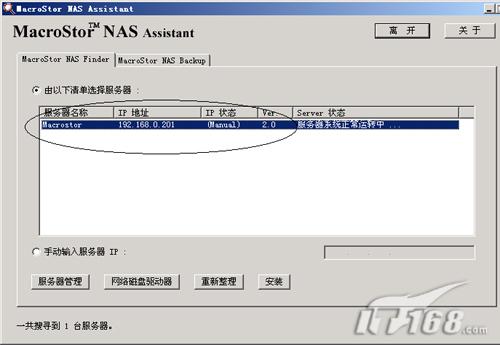 大多数NAS产品都会有一个配套光盘,我们可以通过光盘中的配置工具对NAS进行设置,更加方便简单,而且利用这些工具我们可以在不知道NAS默认IP的情况下对其配置。macrostor nas产品在其配套光盘中提供了一个名为MacroStorAssist.exe的工具,启动该软件后会自动搜索NAS服务器,(如图6)搜索到NAS服务器后点下方的“服务器管理”按钮就会自动跳转到NAS管理界面了,是不是非常方便呢?
