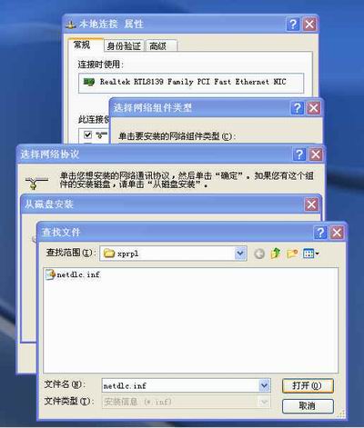 所需软件:http://www.hhgcnet.com/xprpl.zip,将下载后的文件解压到一个目录中(如 D:XPRPL),注意如果您使用的是10/100自适应的网卡,一定要将网线的另一端联好开机,即保证“本地连接”是启用的,在“本地连接”中选择<安装>,选择协议从磁盘安装,定位到XPRPL 目录,就能成功的安装DLC 协议了。