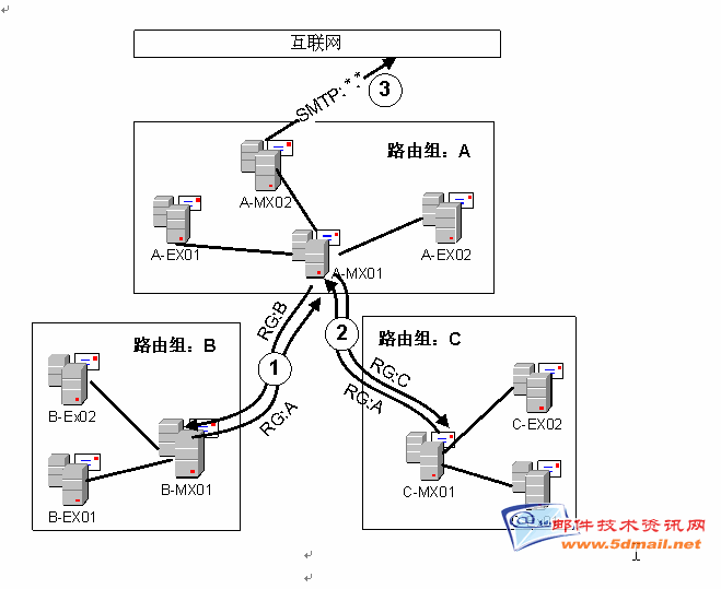 路由组通常由一些具有高速连接或者地理位置分布上靠近的服务器所组成。在路由组内部,服务器之间的邮件传递是通过直接连接进行的。例如,当图一C路由组中C-EX02服务器上的邮箱用户发信给C-EX01服务器上的邮箱时,C-EX02的SMTP引擎和C-EX01建立直接的连接并进行邮件投递。