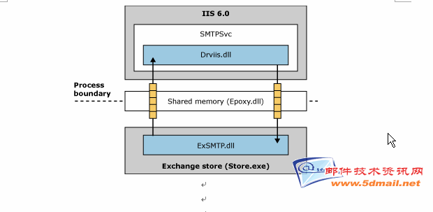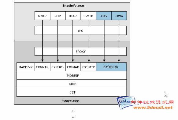 如图五,Epoxy.dll不仅为SMTP服务和Store建立了快速通道,实际上,通过Epoxy,IIS中的多个服务都可以与Store里面对应的模块进行快速通信。举例来说,当用户通过OWA访问邮件时,IIS就是通过IFS和Epoxy到数据库中去获取邮件的;POP3服务也是同样,当用户使用POP3客户端收信时,邮件通过Expop3-->Epoxy-->IFS-->POP3这样的路径传递到IIS,最终通过网络到达客户端。