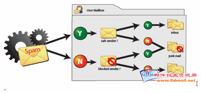Outlook 2003 and Outlook Web Access for Exchange Server 2003 also allow users to create a list of safe senders from whom users always want to accept e-mail messages, as well as a list of blocked senders from whom users always want to reject e-mail messages. At the mailbox store, regardless of the SCL rating assigned to the message, Exchange delivers all messages from safe senders to the user's inbox and all messages from blocked senders to the user's junk e-mail folder. However, if the e-mail message has been blocked by the gateway threshold, it is not delivered to the user's inbox because the message is never delivered to the mailbox store.
