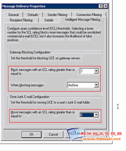 2. Store junk e-mail configuration: Move messages with an SCL rating greater than. If the message is greater than the value set here, the message will be delivered to the junk e-mail folder of the user’s inbox, unless the user has the sender on their safe senders list.