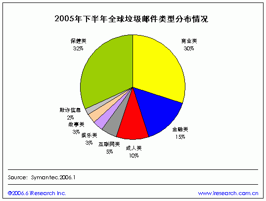 iResearch艾瑞市场咨询根据Symantec统计数据显示,2005年下半年全球邮箱收到垃圾邮件类型情况:保健类信息所比例最高,达32%,其次为商业类信息,占30%,金融类信息占15%,成人类占10%。互联网类、娱乐类、故事类、和欺诈类信息较低,约占其余13%,其中欺诈类占2%。