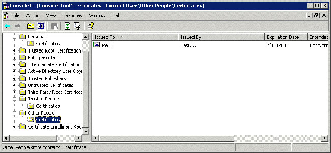 当证书使用 EFS 时,它将被缓存到本地机器上。这避免了每次将新用户添加到加密文件时在 Active Directory 中查找用户的必要。隶属于证书链的证书以及自签证书可被使用和缓存。当隶属于证书链的证书被添加到加密文件时,它将被缓存到当前用户的“其他人”证书储存区,如下图 9 中所示。
