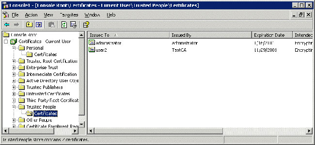 当证书被添加到“受信任人”存储区时,系统将被警告用户,该证书将被明确信任并要求用户验证该操作。一旦某证书被添加到“受信任人”存储区,除了时间有效性之外,将不执行证书的状态检查。Microsoft Outlook? 2002 客户端还可以使用“受信任人” CryptoAPI 存储区进行单个证书信任决策的存储。