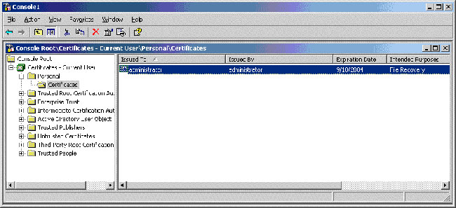对于独立的计算机而言,默认的恢复代理在本地进行配置。对于隶属于 Active Directory 域的计算机而言,在域、组织单元 (OU) 或单个计算机级别上对恢复代理进行配置,并应用到所定义的影响范围内所有的 Windows 2000 和 Windows XP 计算机上。恢复证书由证书颁发机构 (CA) 颁发并使用微软管理控制台 (MMC) 证书管理单元进行管理。