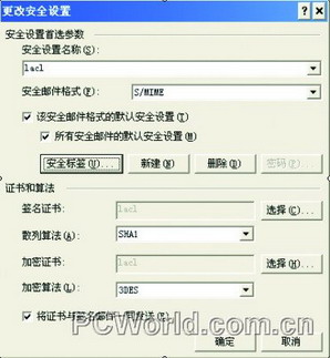 启动Outlook XP,在主窗口点击菜单“工具”/选项/安全,单击“设置”按钮,弹出“更改安全设置”画面(见图6),输入安全设置名称lacl,勾选默认安全设置,点击“选择”为帐户绑定一个数字证书,最后单击“确定”退出。以后发送数字签名邮件时,将使用该证书进行签名。