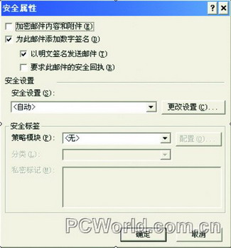 加密邮件的发送方法,与以上发送签名邮件的方法类似,不过当你点击“安全设置”按钮,在安全属性窗口中,要勾选“加密邮件内容和附件”。