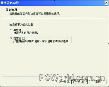 运行signcode.exe出现一个向导,先选择你要签名的程序文件,然后出现签名选项,选择“自定义”(右图8);当提示选择使用的签名证书时,按“从文件选择”按钮,文件类型选择X.509,选择你的签名证书lacl.cer;按“下一步”,然后点“浏览”安装私匙文件lacl.pvk;最后在提示你加入时间戳时,选择“不加入时间戳”。