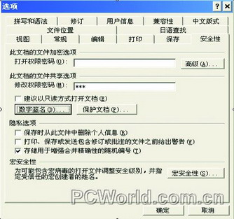 以后别人打开该文档,单击“工具”/选项/安全性”菜单,在此处看到你的数字证书,就知道该文档是你编写的,因为有你的数字签名。