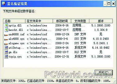 单击菜单“开始/运行”,键入“sigverif”打开“文件签名验证”窗口,然后点击“开始”按钮检查每个系统文件的数字签名,过一会儿将显示一个画面(见图10),列出所有未经过数字签名的文件,如果你发现列表中有winlogon.exe、licdll.dll这两个文件,那么你的Windows就被篡改过了,否则即为微软原版的。