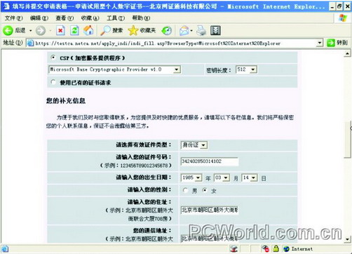 打开http://www.cnca.net/网页,点击“个人数字证书”栏下的“立即试用”,弹出一个页面,要求你安装根证书(即CA证书链),单击“安装证书链”按钮,系统将提示是否将证书添加到根证书存储区,选择“是”;然后进入“基本信息”表单,输入你的个人资料,在CSP栏目中选择“Microsoft Base Cryptagraphic Provider V1.0”(见图2),填写补充信息,例如有效证件类型、证件号码、出生日期等等,存储介质选择“本地”将证书保存在本机硬盘上;最后点击“提交”按钮进行申请。