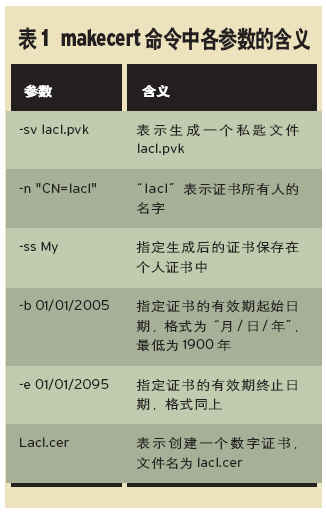 makecert -sv lacl.pvk -n "CN=lacl" -ss My -b 01/01/2005 -e 01/01/2095 lacl.cer
